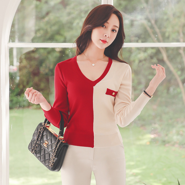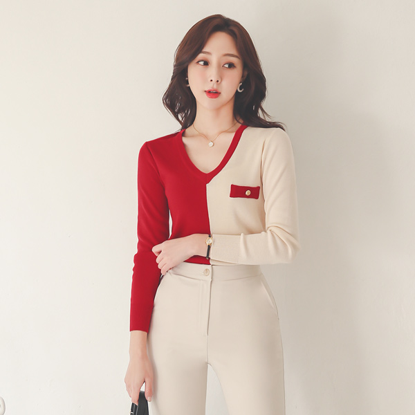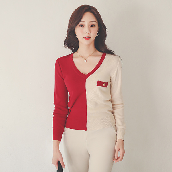 Harp Color Combination Antique Button V-neck Knit T-shirt