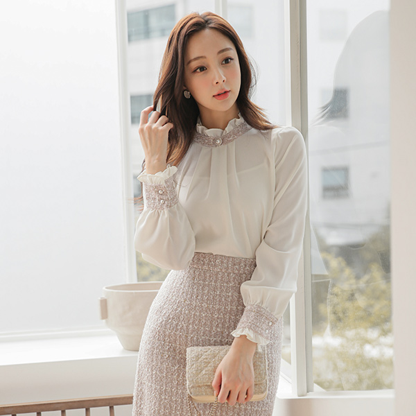 Gold Pearl Tweed Color Combination Pintuck Frill Neck Blouse
