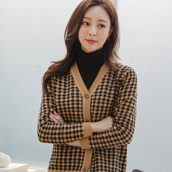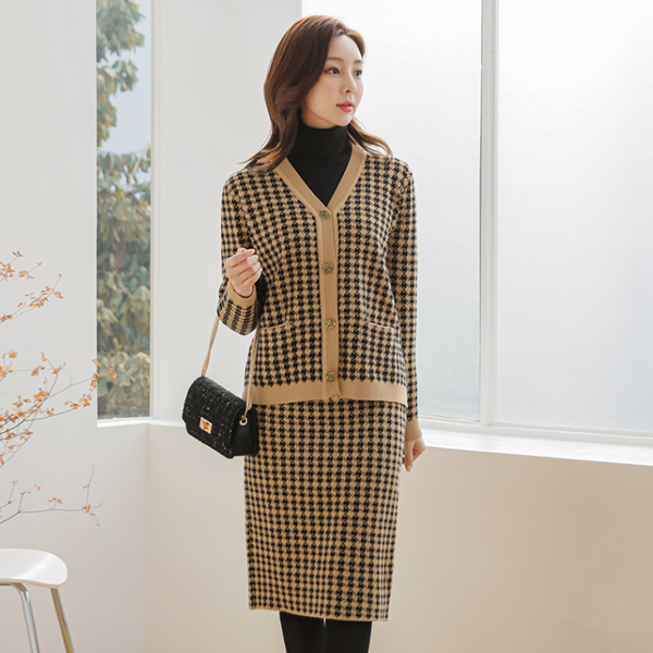 Hound's-Tooth Gold Button Knit Cardigan&Skirt SET
