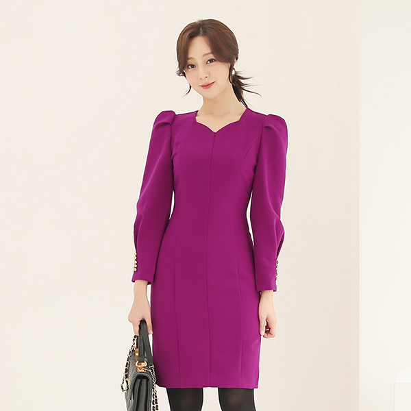 Heart Neck Puff Gold Button Dress