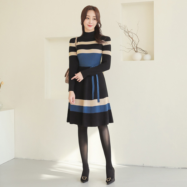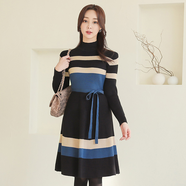 multi Color Combination Belted Half-Neck Knit Dress