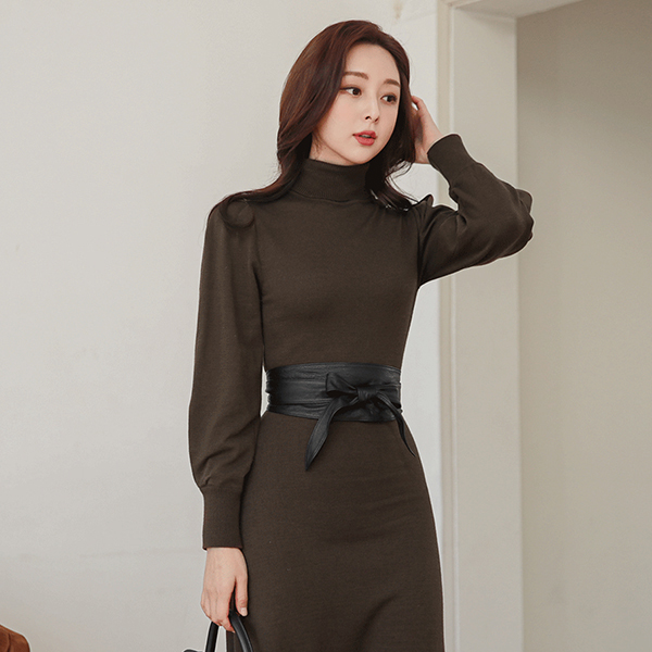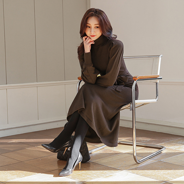 Volume Pintuck Puff Turtleneck Knit Long Dress