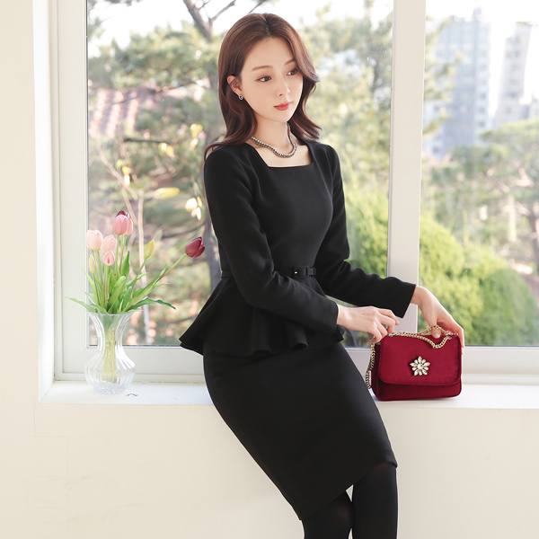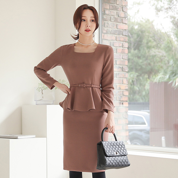 Square Neck Peplum Belted Span Dress