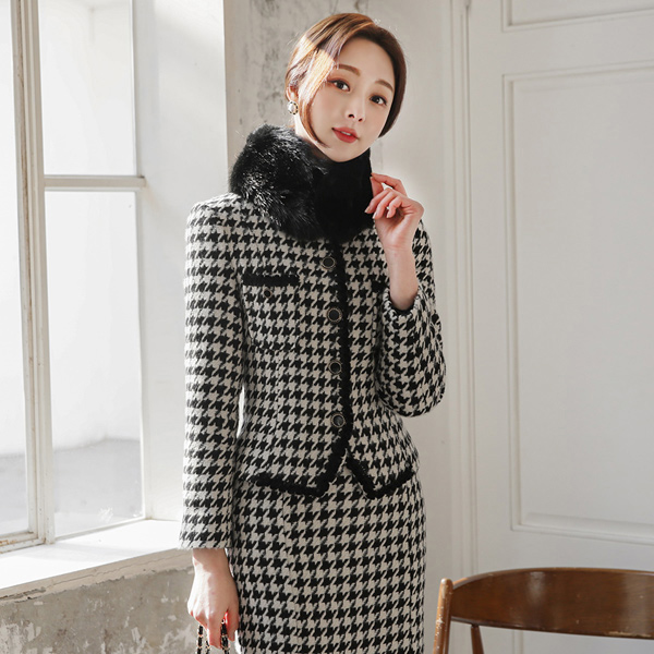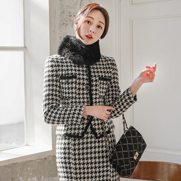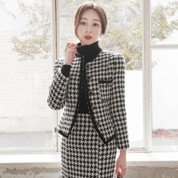 Hound's-Tooth Braid Trimming Gold Button Jacket