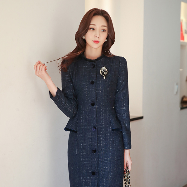 Real Mink Trimming Pearl Tweed Peplum Dress