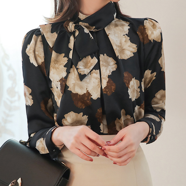 Skily Flower Pintuck Scarf-Neck Blouse