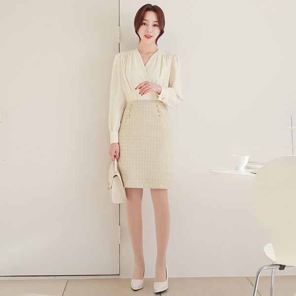Double-button Tweed Color Combination Shirring Surplice Dress