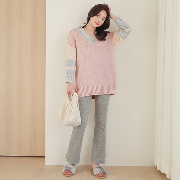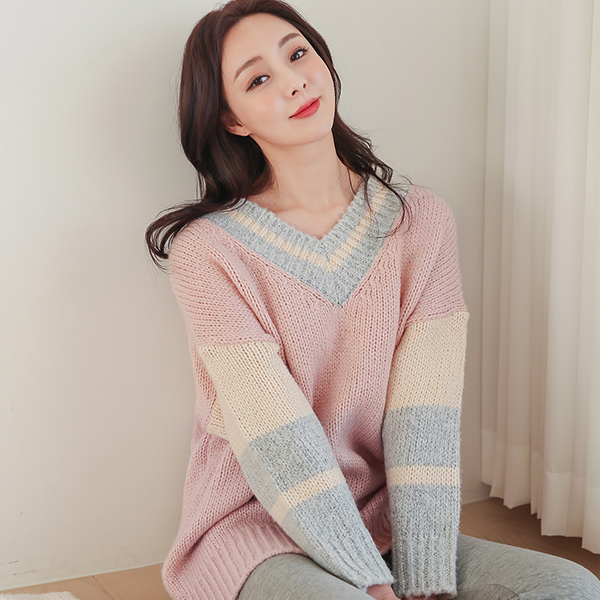 Deep V-neck Color Combination Knit Long Knit
