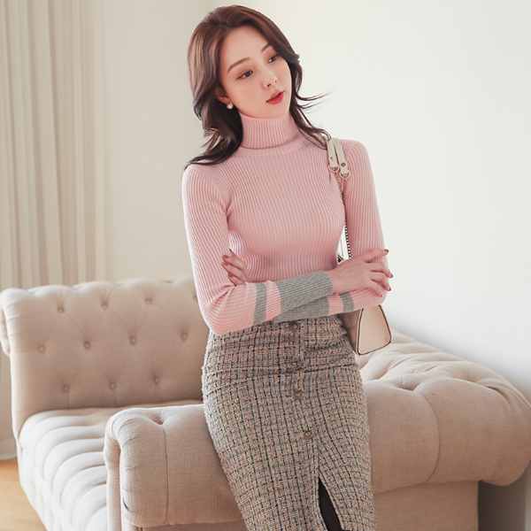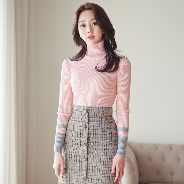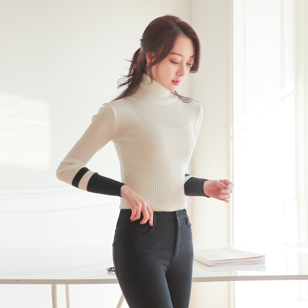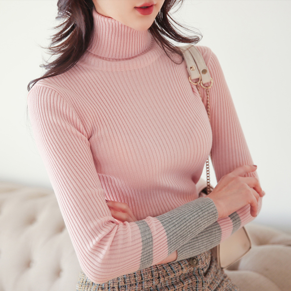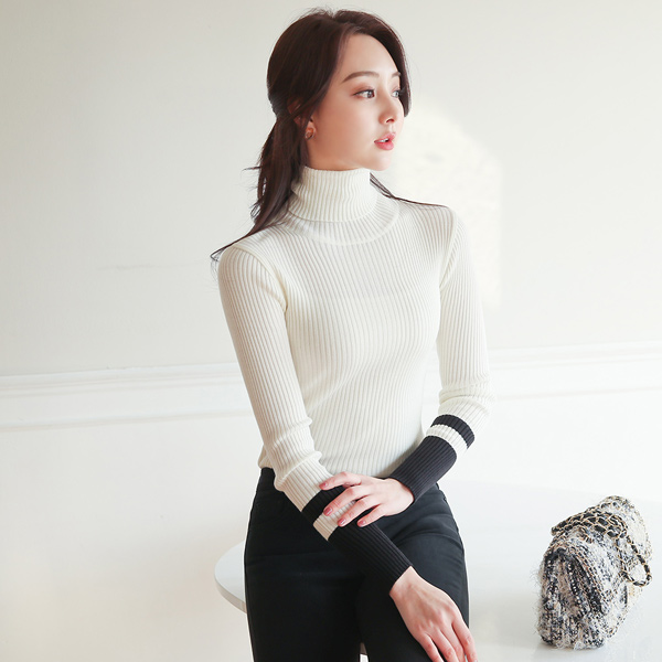 Cuffs Line Color Combination Corduroy Turtleneck Knit T-shirt