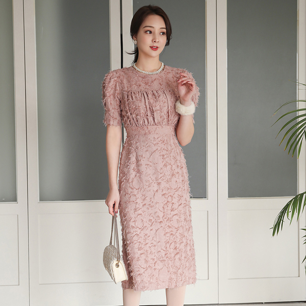 Feather Fringe Pintuck-Shirring Back Banding Midi-Dress