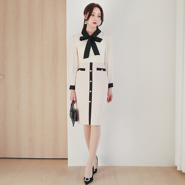 Ribbon Collar Color Combination Double Pocket Dress