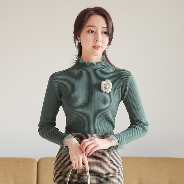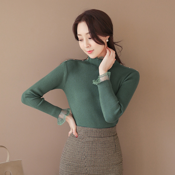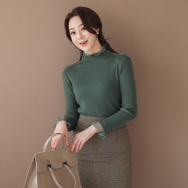 Frill Lace Trimming Shoulder Button Corduroy Knit