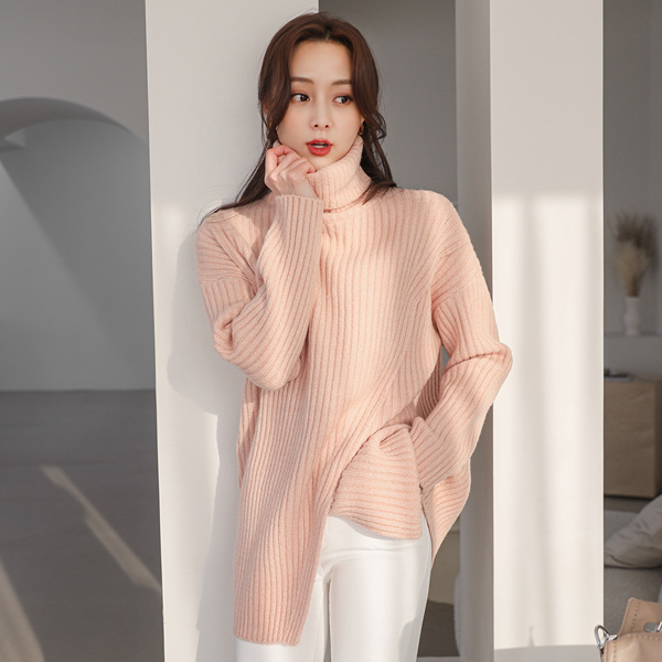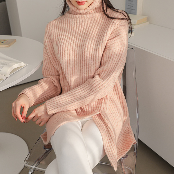 Bold Corduroy Turtleneck Diagonal Slit Long Knit
