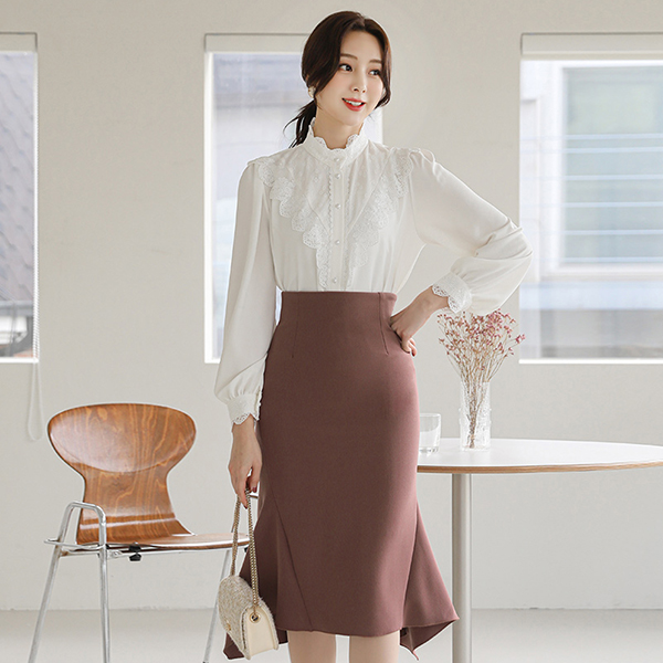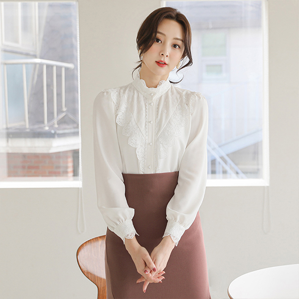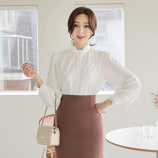 VLace Trimming High-Neck Blouse