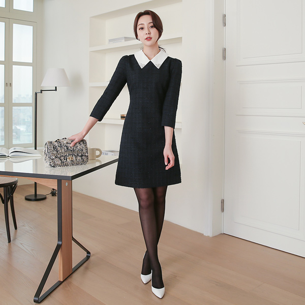 Fringe Tweed Pearl Beads Collar Color Combination Dress