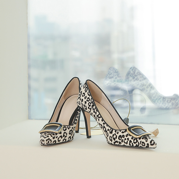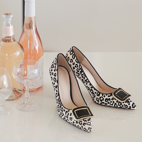 Leopard Enamel Buckle Calf Stiletto Heels