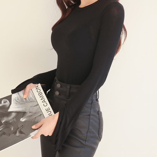 Frill Line Bell Sleeve Slit Tencel Slim T-shirt