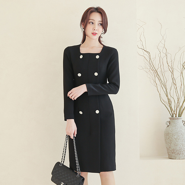 Square Neck Knitting Antique Double Button Dress