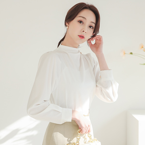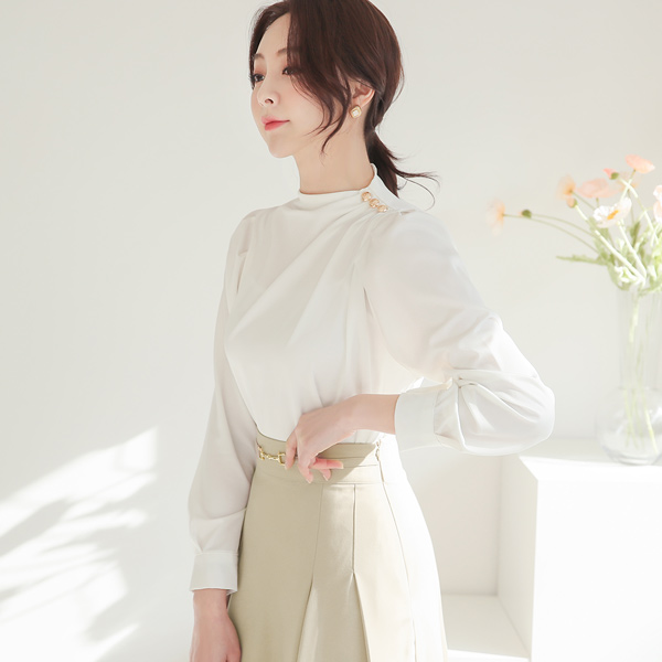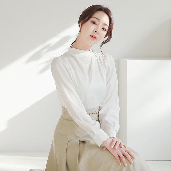 Satin Gold Button Pintuck-Shirring Funnel Neckline Blouse