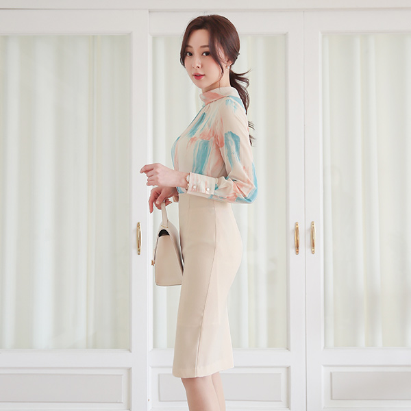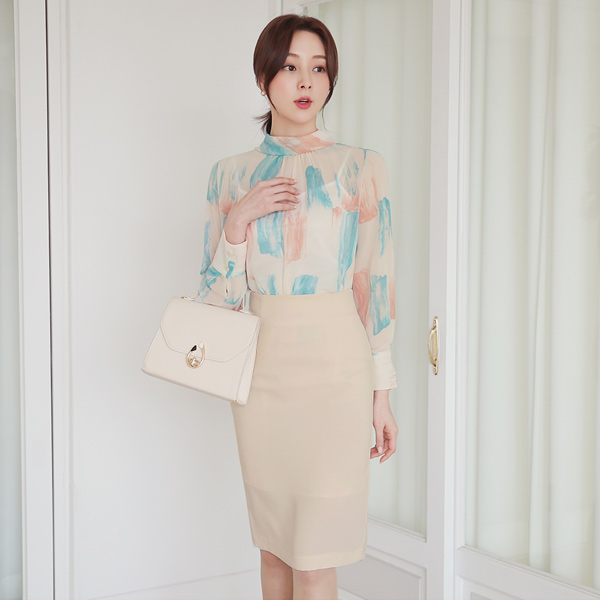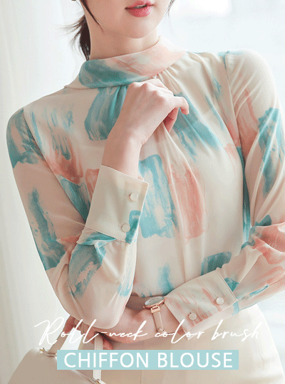 Roll-Neck Color Brush Chiffon Blouse