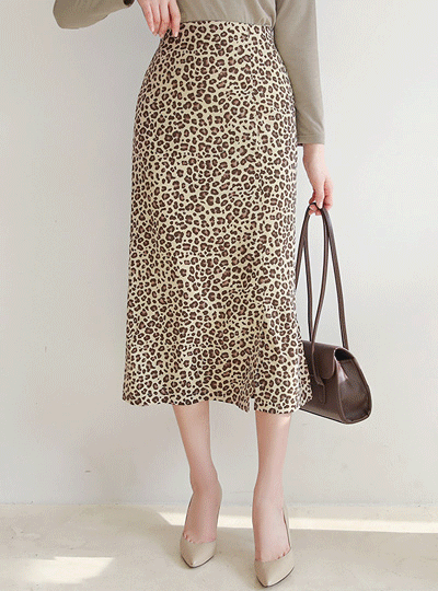 Leopard Unbalance Slit Back Banding A-line Skirt