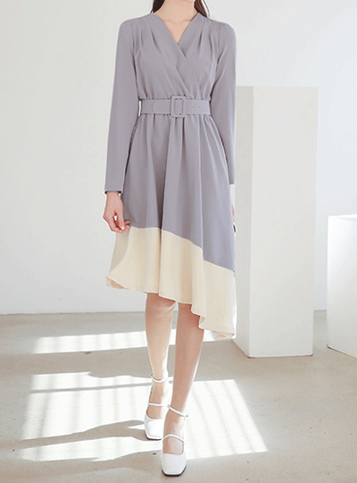 Shoulder Pintuck Diagonal Unbalance Color Combination Flared Dress