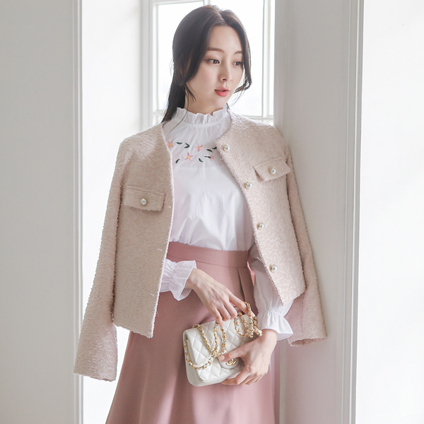 Frill Neck Flower Embroidery Cotton Blouse