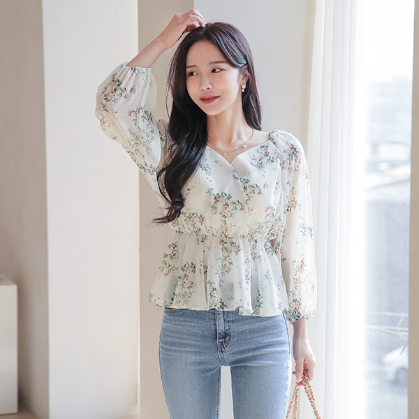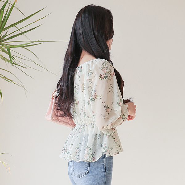 Peony Heart Neck Banding Flared Chiffon Blouse