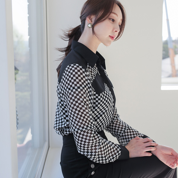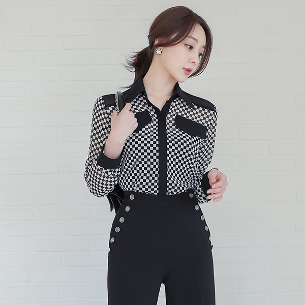 Chess Pocket Color Combination See-through Chiffon Blouse