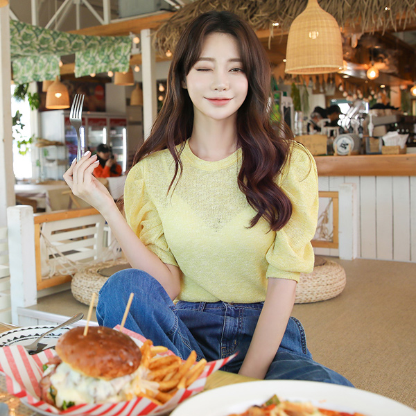 Summer Linen Shirring Puff Knit T-shirt