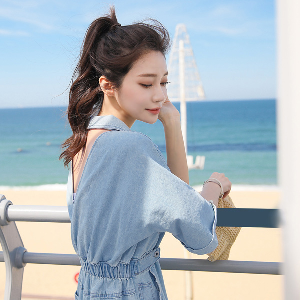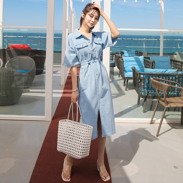 Back Line Center Front Vent Snap Button Denim Dress