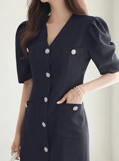 Classic Mood Silver-Button Puff Dress