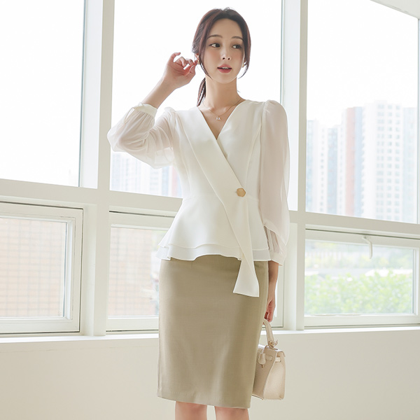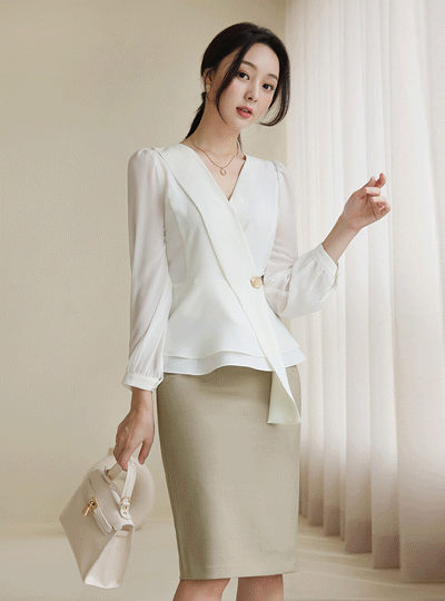 Chiffon Sleeves Unbalance Peplum Wrap-Blouse