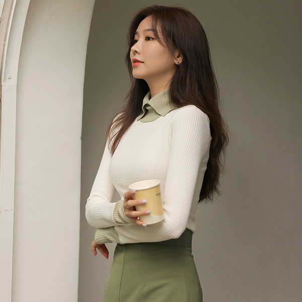 Cutting-line Turtleneck Corduroy Knit T-shirt