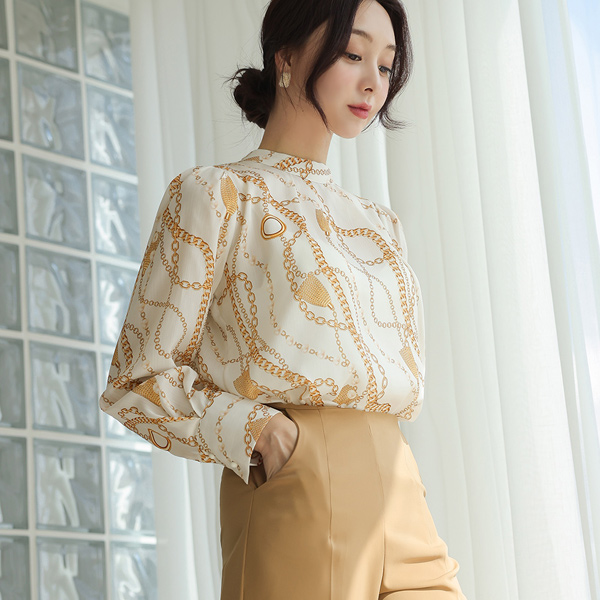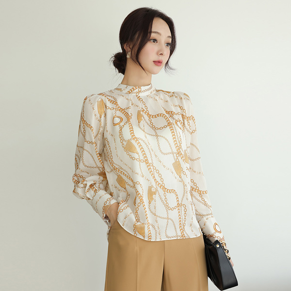 Luxury Gold Chain Shirring Half-Neck Blouse
