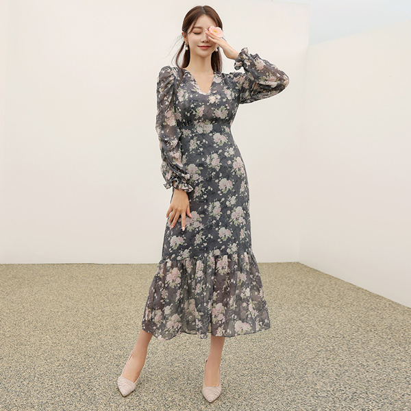Misty Flower Shirring Ruffle Chiffon Dress