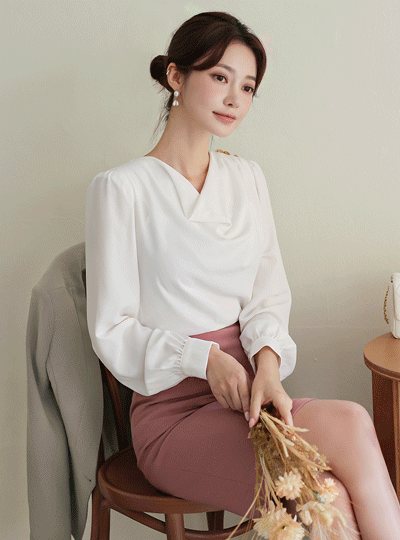 Glam Draping Pearl Buttons Cowl Neck Blouse