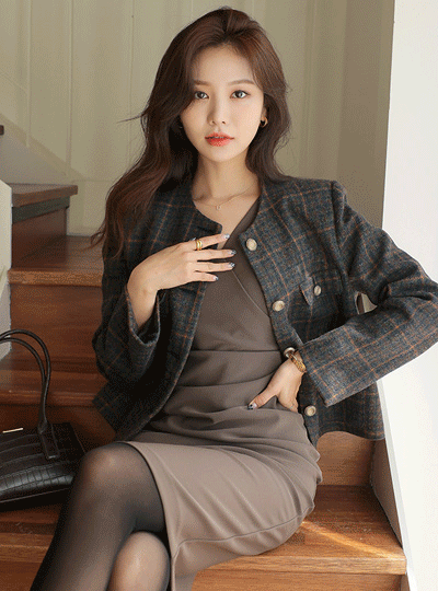 Cozy Check Gold Button Wool Semi- Crop Jacket