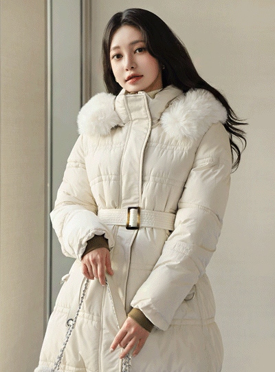 Color Combination Point ECO-Fur Hood quilting Long-Padded Jumper