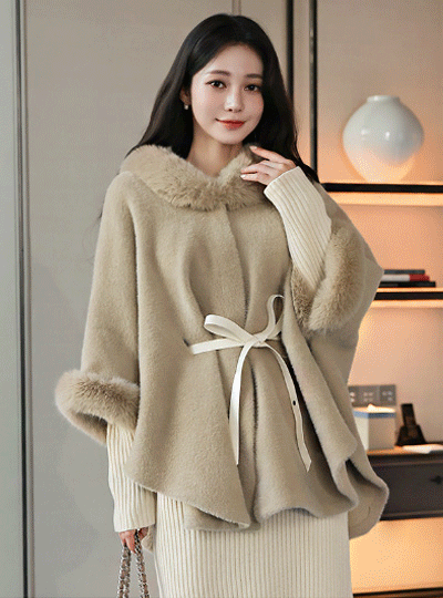 Biscos Fur Trimming Cape Angora Wool Coat