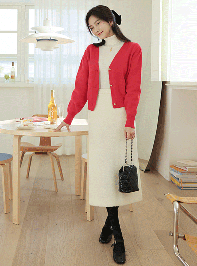 Lovely Gold Ring Heart button Volume puff Wool Cardigan