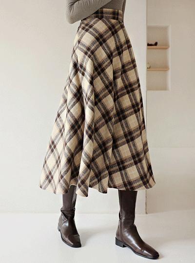 Back Banding Check Flared Wool Skirt