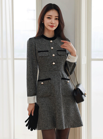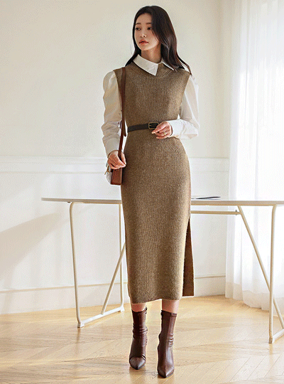 Unbalance Collar Shirt&Long Knit DressSET (3pcs)