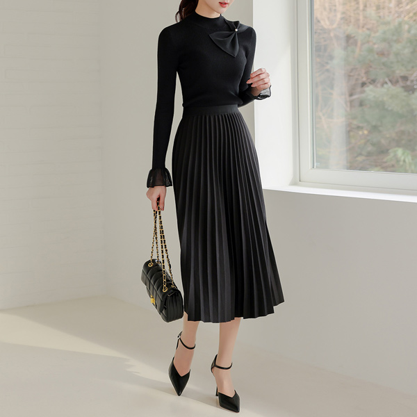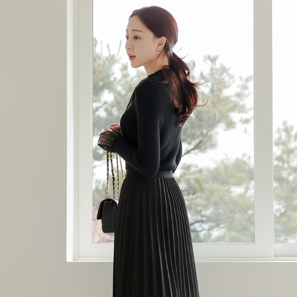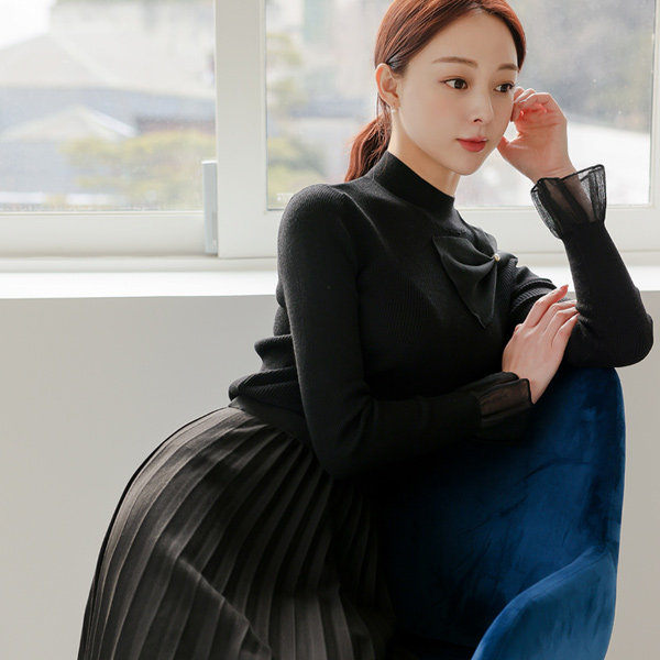 Organza Ribbon Bell Sleeves Corduroy Knit T-shirt