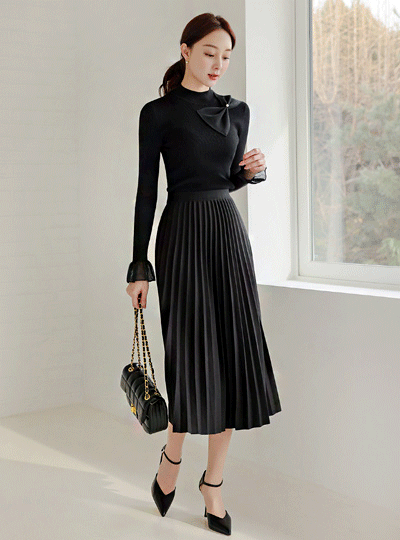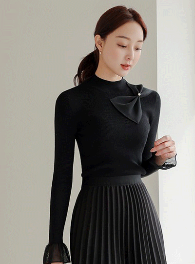 Organza Ribbon Bell Sleeves Corduroy Knit T-shirt