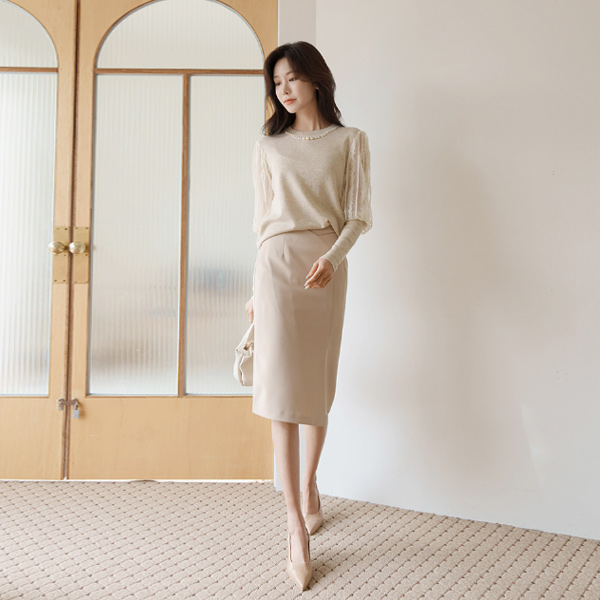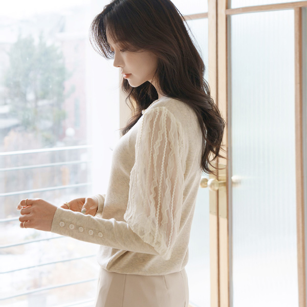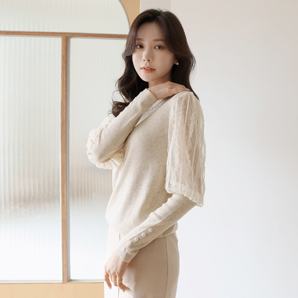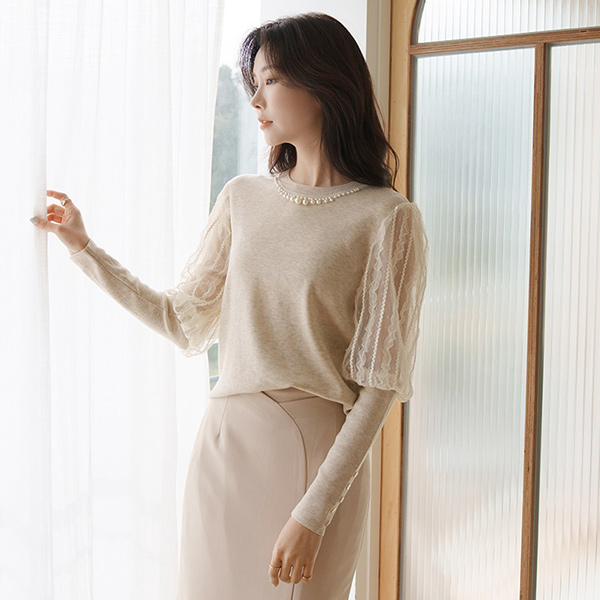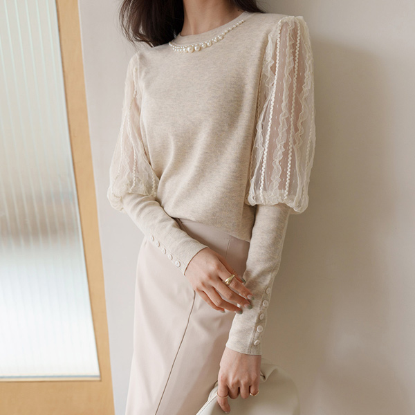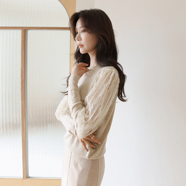 Elegance Lace Sleeves Pearl Neck Knit