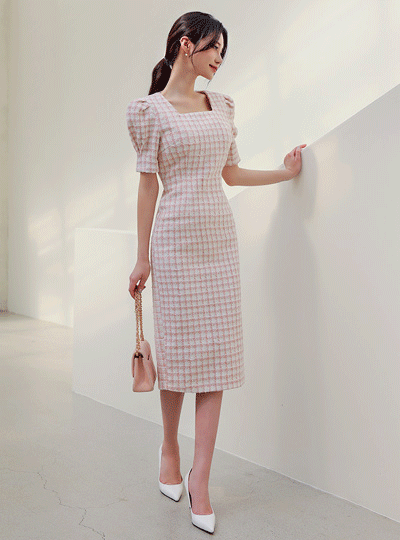 Lovely Square Neck Puff Tweed Dress
