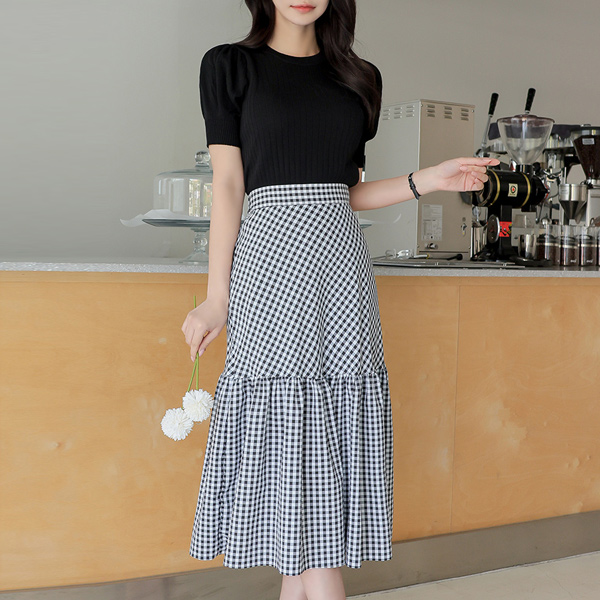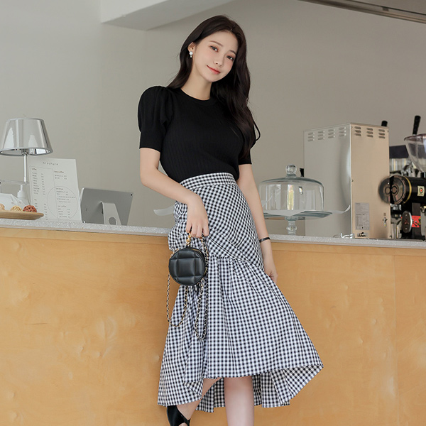 Diamond Corduroy Puff Sleeves Knit T-shirt