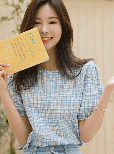 Pastel Check Patterns Lovely Sleeves Shirring Waffle Blouse