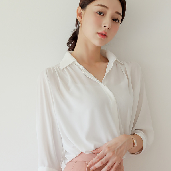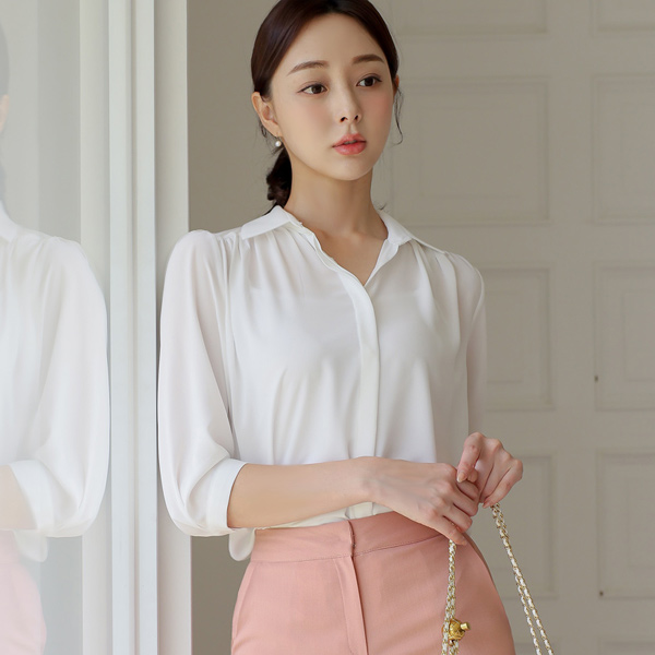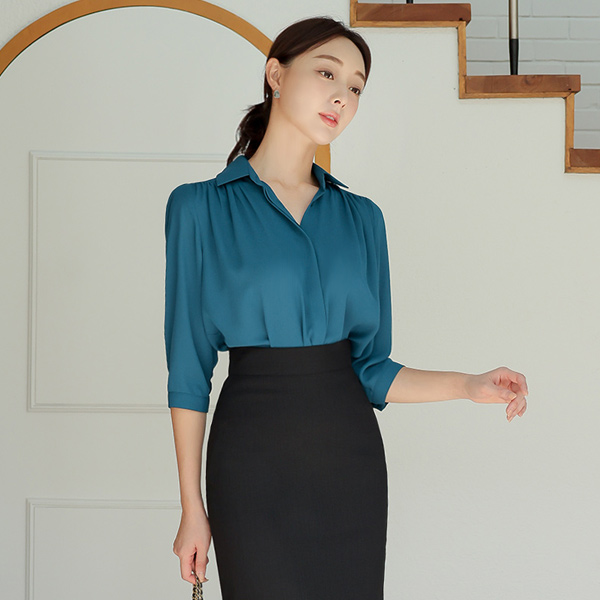 Gather Shirring Hidden Button Collar Blouse(Capri)